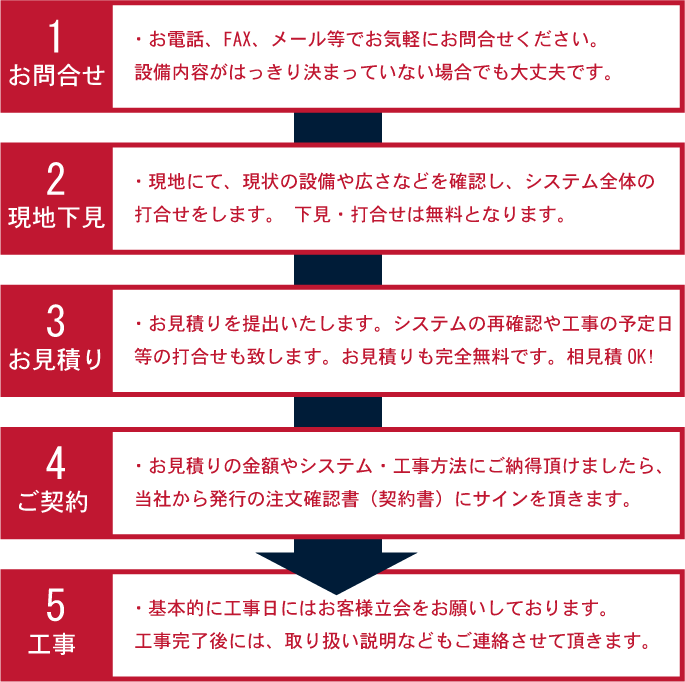 商業施設や工場、幼稚園保育園などの教育機関には構内放送設備が欠かせません。 ラジオ体操からチャイム、呼び出しや緊急連絡、構内放送(校内放送)で施設の隅々まで音楽や音声を届けます。 レストランや美容院などのBGMなど、音楽環境を構築します。また、商業施設で使用されている業務用電話機(ビジネスホン)に絡んだ構内放送システムの構築も得意としております。 弊社では『放送』と『音響』の2つの側面からお客様に合った『音空間』 を御提供いたします。 お支払はリース、現金(振込・集金)、クレジットと3パターンからお選び頂けます。